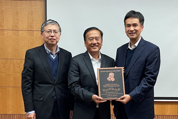 倪福弟書記與許琛琦研究員為王曉東院士頒發(fā)王應睞講座榮譽證書