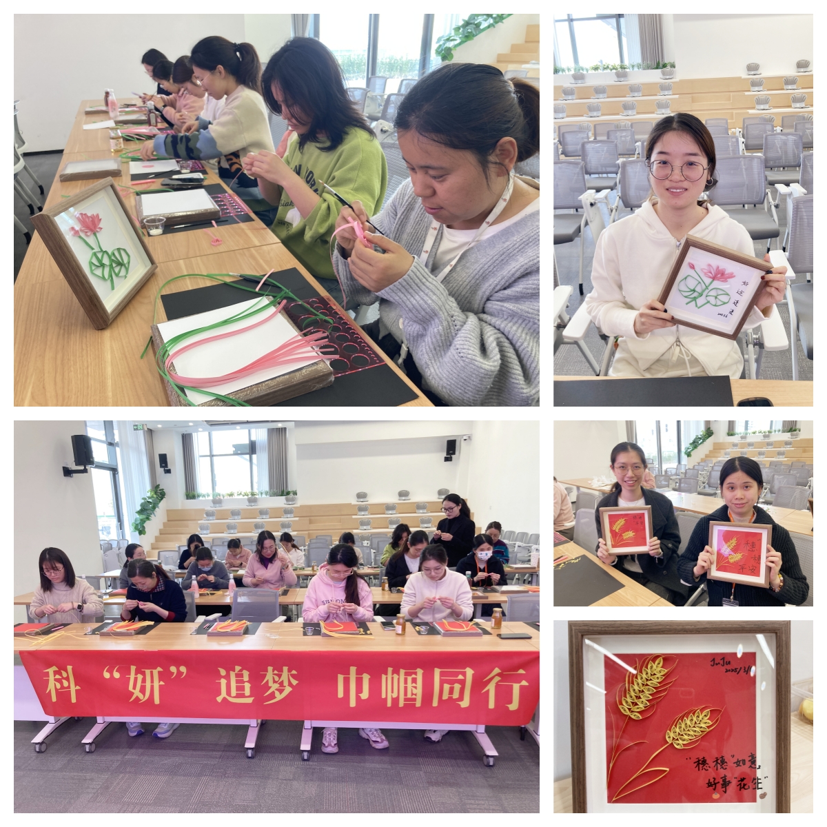 在專業(yè)老師的指導下,衍紙組的“能工巧匠”們手持鑷子,將細長的彩紙卷通過卷、捏、拼等手法制作出象征福運的蓮花與平安的麥穗,為大家送上“好運蓮蓮”和“穗穗平安”的祝福;繞線畫組則在木質(zhì)底板上以白色絲線為筆,通過精密纏繞勾勒出駿馬的輪廓,以“馬到成功”的美好喻意許愿中心的女性科技工作者在科學的廣闊天地自由馳騁;報名時最受青睞的絨花組拿出了科研人做實驗時嚴謹細致的認真勁兒,一枚枚或典雅或婉約的絨花胸針與發(fā)簪在她們手中誕生,為春日增添了一抹亮麗色彩?;顒蝇F(xiàn)場歡聲笑語連連,大家專注雕琢手中作品的同時,時不時交流創(chuàng)作心得,在“擇一事終一生”的匠人精神與“獻身、求實、團結、奮進’的胰島素精神碰撞中為創(chuàng)新思維蓄力賦能。