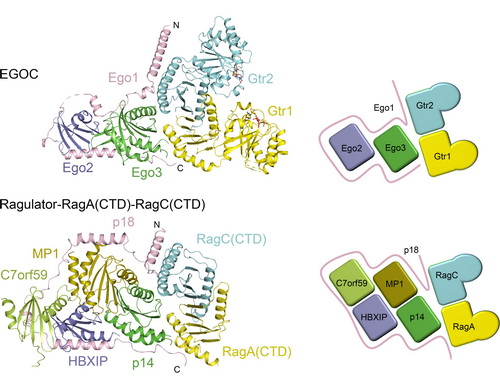 酵母EGOC與人源Ragulator-RagA(CTD)-RagC(CTD)復(fù)合物的結(jié)構(gòu)比較