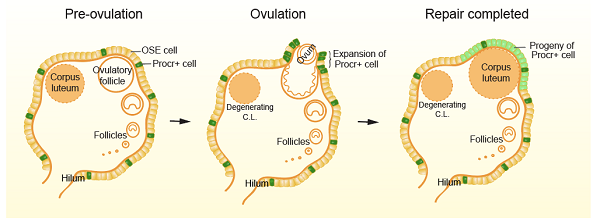 Proposed model of Procr+ progenitor cell activity during ovulatory rupture repair
