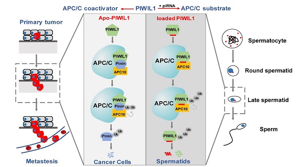 通過與多家醫(yī)院及實驗室合作,發(fā)現(xiàn)PIWIL1在胰腺癌細胞中異常表達并促進胰腺癌細胞增殖和轉(zhuǎn)移。然而,在表達PIWIL1的多個癌細胞中均未發(fā)現(xiàn)piRNA明顯表達,提示PIWIL1在癌細胞中可能以一種不依賴于piRNA的模式發(fā)揮作用。研究組之前的研究曾發(fā)現(xiàn)PIWIL1與APC/C相互作用,且證明PIWIL1是APC/C底物,但PIWIL1只有在結(jié)合piRNA的條件下才能被APC/C泛素化修飾。當前這個研究發(fā)現(xiàn),在不表達或低表達piRNA的癌細胞中,PIWIL1仍然與APC/C相互作用,但此時PIWIL1作用為APC/C的co-activator激活APC/C。這些發(fā)現(xiàn)共同表明,piRNA存在與否決定了PIWIL1與APC/C互作的后果:在富含piRNA的精子細胞中,PIWIL1作用為APC/C的底物,通過APC/C啟動其在精子變形后期的降解清除,促進精子形成;在不表達或低表達piRNA的癌細胞中,PIWIL1作用為APC/C co-activator,通過激活癌相關(guān)底物蛋白泛素化降解,發(fā)揮促癌作用。進一步發(fā)現(xiàn),