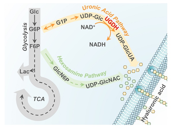 糖醛酸途徑是糖酵解的分支通路。糖醛酸途徑的原料來自于糖酵解的中間代謝產(chǎn)物葡萄糖6-磷酸。經(jīng)過幾步反應(yīng)最終生成UDP-葡萄糖醛酸。UDP-葡萄糖醛酸與己糖胺途徑(Hexosamine Pathway)生成的UDP-乙酰氨基葡萄糖一起用于糖胺聚糖,如透明質(zhì)酸(Hyaluronic Acid, HA)等物質(zhì)的生物合成。