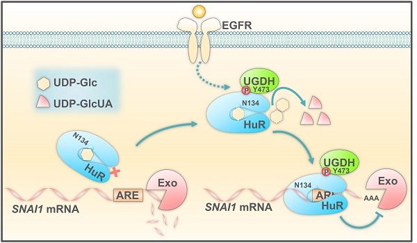 UDP-Glc與RNA結(jié)合蛋白HuR相互作用,競爭性抑制HuR對SNAI1 mRNA的穩(wěn)定效應(yīng),從而抑制肺癌轉(zhuǎn)移;EGFR信號激活可促使UGDH與HuR結(jié)合,并將UDP-Glc轉(zhuǎn)化為UDP-GlcUA,從而解除了它對肺癌轉(zhuǎn)移的抑制。