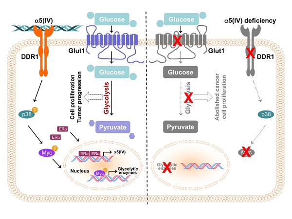 進(jìn)一步的研究發(fā)現(xiàn)α5(IV)膠原蛋白對(duì)維持管腔型乳腺癌的增殖潛能至關(guān)重要。敲低α5(IV)抑制了管腔型乳腺癌細(xì)胞葡萄糖攝取、有氧糖酵解與ATP合成,從而抑制腫瘤細(xì)胞增殖。分子機(jī)制上,α5(IV)膠原蛋白通過其非整合素受體DDR1及其下游p38 MAPK調(diào)控c-Myc轉(zhuǎn)錄因子的磷酸化和轉(zhuǎn)錄活性,進(jìn)而調(diào)節(jié)葡萄糖轉(zhuǎn)運(yùn)蛋白Glut1與糖酵解通路代謝酶的表達(dá),促進(jìn)細(xì)胞增殖和腫瘤生長(zhǎng)。α5(IV)膠原蛋白缺失的細(xì)胞中回補(bǔ)組成型激活形式的DDR1受體或c-Myc可以恢復(fù)管腔型乳腺癌細(xì)胞的糖酵解與細(xì)胞增殖。