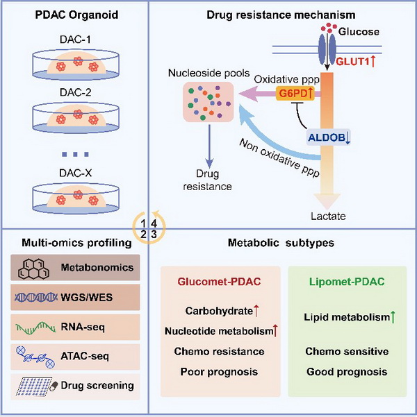 8月18日,國(guó)際學(xué)術(shù)期刊Cell Reports Medicine在線發(fā)表了中國(guó)科學(xué)院分子細(xì)胞科學(xué)卓越創(chuàng)新中心高棟研究組、陳洛南研究組、楊巍維研究組與海軍軍醫(yī)大學(xué)第一附屬醫(yī)院(上海長(zhǎng)海醫(yī)院)金鋼研究組、中國(guó)科學(xué)院上海營(yíng)養(yǎng)與健康研究所尹慧勇研究組的合作研究成果: Metabolic classification suggests GLUT1/ALDOB/G6PD axis as a therapeutic target in chemotherapy-resistant pancreatic cancer。該研究系統(tǒng)性揭示胰腺導(dǎo)管腺癌(PDAC)的代謝組學(xué)特征,并通過整合代謝組、全基因組、轉(zhuǎn)錄組和藥物敏感性等多組學(xué)數(shù)據(jù)提出不同代謝亞型的化療敏感性機(jī)制及潛在治療靶點(diǎn)。