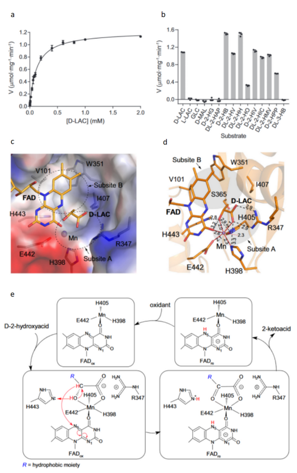 LDHD的酶學(xué)性質(zhì)、活性位點(diǎn)識別底物的結(jié)構(gòu)基礎(chǔ)、以及催化反應(yīng)的分子機(jī)制。a. LDHD催化D-LAC的飽和曲線;b. LDHD對不同底物和類似物的催化活性;c. LDHDFAD+Mn+D-LAC結(jié)構(gòu)中底物結(jié)合位點(diǎn)的表面電勢示意圖,底物結(jié)合位點(diǎn)由親水性的subsite A和疏水性的subsite B組成;d. LDHDFAD+Mn+D-LAC結(jié)構(gòu)中D-乳酸、FAD、Mn2+和周圍氨基酸殘基之間的相互作用關(guān)系,氫鍵相互作用用黑色虛線表示,配位鍵用紅色實(shí)線表示;e. LDHD的催化反應(yīng)機(jī)制。