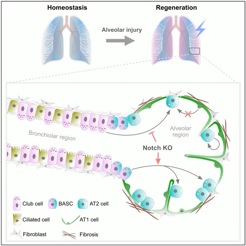 利用雙同源重組酶介導(dǎo)的遺傳譜系示蹤技術(shù)特異性標記各種不同肺上皮細胞,發(fā)現(xiàn)新生AT2細胞除了來源于自我更新外還會起源于club細胞與BASCs,而非AT1細胞。Notch信號通路在club細胞和BASCs向AT2細胞發(fā)生命運轉(zhuǎn)變中發(fā)揮截然相反的作用,即敲除Notch抑制club細胞向AT2細胞命運轉(zhuǎn)變,但促進BASCs向AT2細胞命運轉(zhuǎn)變。