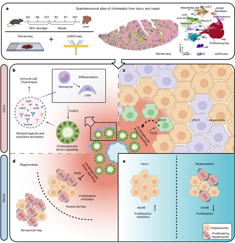 北京時間4月16日,中國科學院分子細胞科學卓越創(chuàng)新中心(生物化學與細胞生物學研究所)惠利健研究組聯(lián)合杭州華大生命科學研究院在國際學術(shù)期刊Nature Genetics發(fā)表了最新研究成果:“A spatiotemporal atlas of cholestatic injury and repair in mice”。該研究以細胞水平的空間分辨率描繪了膽汁淤積與再生過程中的損傷響應(yīng)和微環(huán)境信號的時空動態(tài)變化特征,發(fā)現(xiàn)膽管細胞在膽汁淤積損傷下作為信號樞紐,與門靜脈區(qū)域免疫細胞重塑和肝細胞重編程高度相關(guān)。同時,研究還發(fā)現(xiàn)Atoh8是限制肝細胞增殖的重要因子,為解析肝臟區(qū)域性損傷以及膽管相關(guān)疾病的治療提供了新的視角和可能的新靶點。