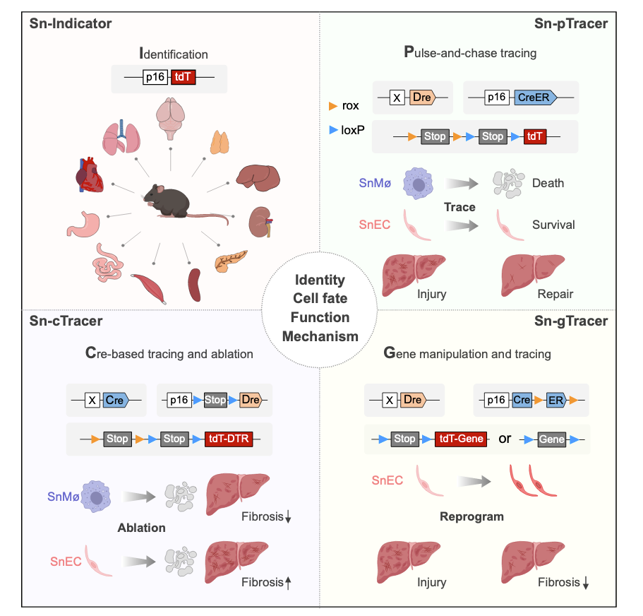 北京時(shí)間10月4日,國際學(xué)術(shù)期刊Cell在線發(fā)表了中國科學(xué)院分子細(xì)胞科學(xué)卓越創(chuàng)新中心(生物化學(xué)與細(xì)胞生物學(xué)研究所)周斌研究組的最新成果“Identifying specific functional roles for senescence across cell types”。該研究基于雙同源重組酶系統(tǒng)建立了體內(nèi)細(xì)胞衰老的譜系示蹤及功能研究技術(shù),系統(tǒng)探討了肝臟損傷和修復(fù)過程中不同細(xì)胞類型衰老細(xì)胞的命運(yùn)軌跡及其特定作用。這一研究工作不僅為肝臟疾病的臨床治療提供新的研究方向和理論依據(jù),也為細(xì)胞衰老領(lǐng)域和再生醫(yī)學(xué)研究提供了新的技術(shù)路徑與方法。