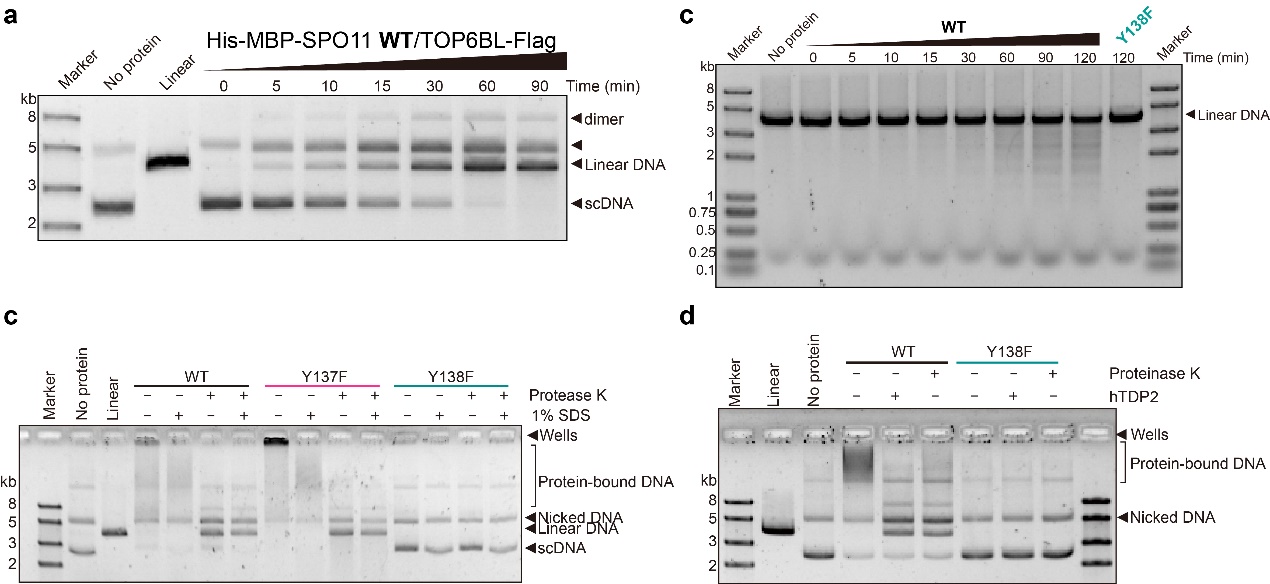 (a)SPO11-TOP6BL對超螺旋質(zhì)粒的切割實(shí)驗(yàn),隨著反應(yīng)時(shí)間增加,質(zhì)粒逐漸被切割成線性(b)SPO11-TOP6BL對線性DNA的切割實(shí)驗(yàn),隨著反應(yīng)時(shí)間增加,長的線性DNA逐漸被切割成不同長度的DNA片段(c)添加SDS并不能破壞蛋白和DNA的互作,表明SPO11-TOP6BL切割DNA后共價(jià)連接在DNA上(d)hTDP2能破壞SPO11和DNA的互作,表明SPO11與DNA的共價(jià)連接通過SPO11的Y138殘基和DNA的5'端之間形成的5'磷酸酪氨酸鍵實(shí)現(xiàn)