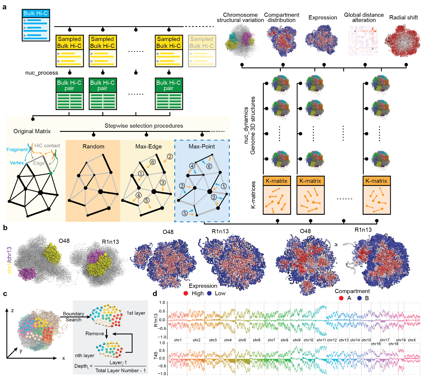 a, K-matrix方法圖示;b,chr1和chr13在融合細胞R1n13的模型中相互接近,以及表達譜和A/B區(qū)室的分布;c,分層解析算法圖示;d,在R1n13中,染色體在融合后并未發(fā)生明顯變化,而在T45中觀察到融合染色體的極性定位發(fā)生一定改變。