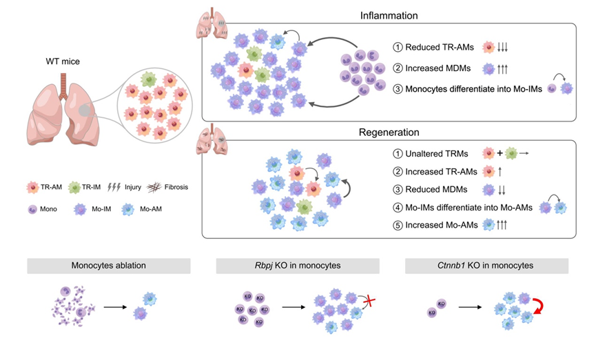 肺部疾病是威脅全球人類健康的重大公共衛(wèi)生問題,急性肺損傷可引發(fā)一系列嚴(yán)重后果,如特發(fā)性肺纖維化、慢性阻塞性肺疾病等。巨噬細(xì)胞作為肺部固有免疫的核心細(xì)胞,在炎癥調(diào)控、組織修復(fù)與纖維化進(jìn)程中扮演關(guān)鍵角色。然而,不同來源巨噬細(xì)胞,包括胚胎發(fā)育來源的組織駐留巨噬細(xì)胞和骨髓單核細(xì)胞招募而來的浸潤(rùn)性巨噬細(xì)胞,在肺損傷后的細(xì)胞命運(yùn)轉(zhuǎn)變、動(dòng)態(tài)響應(yīng)及功能分工,長(zhǎng)期以來尚未被完全闡明。