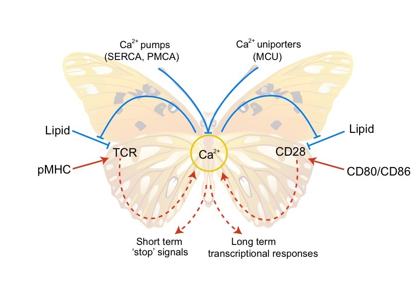 T細(xì)胞的活化主要依賴于抗原受體TCR(T-cell receptor)和共刺激受體CD28。我們的前期研究表明TCR的活性受酸性磷脂調(diào)控。帶負(fù)電的酸性磷脂可以和帶正電的TCR胞內(nèi)區(qū)動(dòng)態(tài)結(jié)合,從而將TCR的磷酸化位點(diǎn)屏蔽在膜內(nèi),保證TCR在靜息態(tài)T細(xì)胞中處于功能關(guān)閉狀態(tài)(Cell 2008)。我們隨后發(fā)現(xiàn)TCR初始信號(hào)引發(fā)的鈣離子內(nèi)流能夠反饋調(diào)控TCR。Ca2+可以直接結(jié)合酸性磷脂的磷酸根,中和其攜帶的負(fù)電荷,從而打破TCR與酸性磷脂之間的靜電相互作用,促進(jìn)TCR功能位點(diǎn)的解屏蔽及磷酸化,從而放大TCR的活化信號(hào)(Nature 2013)。這一新的分子機(jī)制突破了以往對(duì)Ca2+功能的傳統(tǒng)認(rèn)識(shí)。在這項(xiàng)工作基礎(chǔ)上,我們進(jìn)一步發(fā)現(xiàn)Ca2+的正反饋調(diào)控還適用于CD28。酸性磷脂同樣可以屏蔽CD28的磷酸化位點(diǎn),而Ca2+也能夠通過(guò)中和酸性磷脂負(fù)電荷的機(jī)制來(lái)放大CD28信號(hào)(Nature Structural & Molecular Biology 2017)。我們由此提出TCR,Ca2+,CD28這三者之間組成了一個(gè)雙環(huán)路的正反饋網(wǎng)絡(luò),可以將微弱的初始抗原刺激信號(hào)迅速放大,使T細(xì)胞獲得完全的效應(yīng)功能,從而為T細(xì)胞高靈敏性提供了信號(hào)基礎(chǔ)(圖1)。“膜脂調(diào)控”理論在我們的合作研究中同樣被證明適用于多種免疫受體,比如鈣離子在記憶型B細(xì)胞的迅速活化過(guò)程中也起到關(guān)鍵的作用(Nature Communications 2015,The Journal of Physical Chemistry Letters, 2017)。我們也撰寫了多篇綜述來(lái)闡述這個(gè)學(xué)術(shù)思想(Trends Biochem Sci 2014, Trends Immunol 2016, Nat Rev Immunol 2016)。