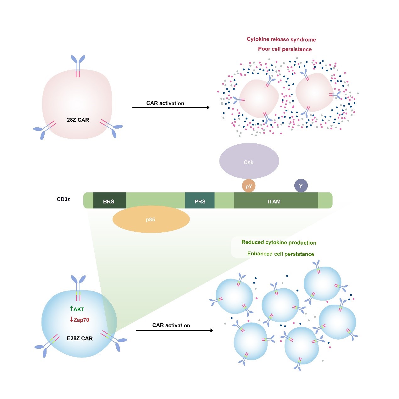 圖4. 基于CD3e 蛋白多重信號(hào)功能而設(shè)計(jì)的新型CAR-T細(xì)胞療法。TCR的CD3e 鏈具有特殊的信號(hào)轉(zhuǎn)導(dǎo)功能,可以同時(shí)招募抑制性分子Csk和活化性分子PI3K。將CD3e 胞內(nèi)區(qū)加入臨床使用的CAR序列中,可使得CAR-T細(xì)胞生長(zhǎng)持續(xù)性更好,抗腫瘤功能更強(qiáng),并且細(xì)胞因子釋放綜合癥的風(fēng)險(xiǎn)降低。