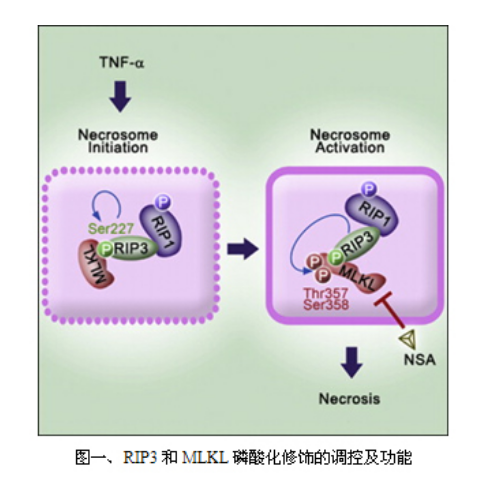程序性細(xì)胞壞死是一種由激酶的激活而引發(fā)的細(xì)胞死亡方式。死亡受體(例如TNFR1)的激活最終可以誘發(fā)程序性細(xì)胞壞死,而起動細(xì)胞壞死的信號轉(zhuǎn)導(dǎo)主要依賴于激酶RIP1和RIP3的調(diào)控。細(xì)胞壞死發(fā)生之后,RIP1與RIP3相結(jié)合并激活了RIP3的激酶活性,然后RIP3發(fā)生自身磷酸化,使其可以特異性的和底物MLKL相結(jié)合,MLKL進而被RIP3磷酸化。這時的RIP1/RIP3/MLKL形成一個有活性的細(xì)胞壞死復(fù)合體,傳遞死亡信號給下游,使細(xì)胞壞死得以最終發(fā)生。