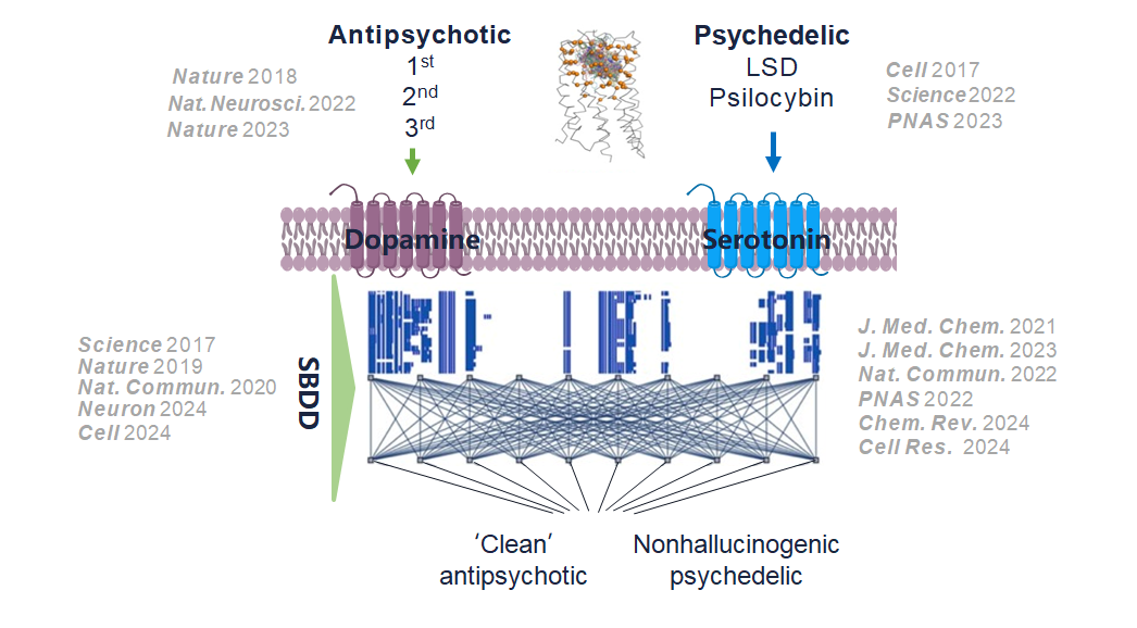 本研究組主要針對精神分裂癥、抑郁及焦慮癥、癡呆癥等神經(jīng)和精神疾病,開展神經(jīng)精神藥物與其靶點(diǎn)的結(jié)構(gòu)藥理研究,以此為基礎(chǔ)展開“更有效”“更安全”的新一代藥物設(shè)計(jì),為神經(jīng)系統(tǒng)疾病提供創(chuàng)新治療和干預(yù)方案。