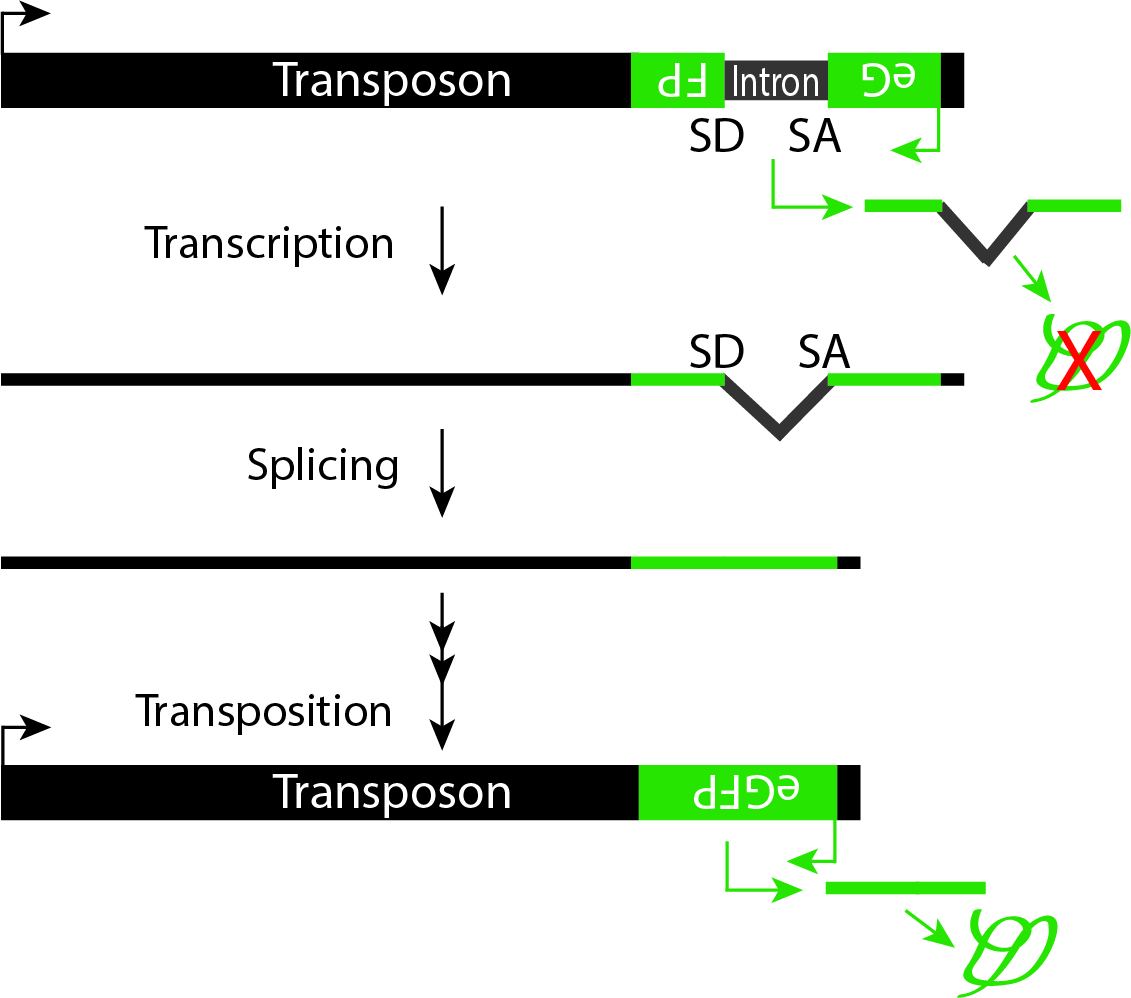 為了解決逆轉(zhuǎn)座子在轉(zhuǎn)座水平的活性,我們建立了一個GFP轉(zhuǎn)座報告基因從而在單細(xì)胞分辨率下去監(jiān)測轉(zhuǎn)座子的轉(zhuǎn)座能力(如下圖)。在此體系中,只有當(dāng)逆轉(zhuǎn)座子的轉(zhuǎn)錄產(chǎn)物中這個內(nèi)含子被剪切掉、轉(zhuǎn)座子mRNA發(fā)生逆轉(zhuǎn)錄、并且完成逆轉(zhuǎn)錄的cDNA整合到基因組DNA中之后這個報告基因才會表達(dá)GFP蛋白。第三代測序技術(shù),也就是納米孔測序技術(shù)(Nanopore Sequencing),能夠直接測上兆堿基長度的DNA。因為轉(zhuǎn)座子在基因組中存在大量的拷貝,所以納米孔測序技術(shù)對于研究單分子水平轉(zhuǎn)座子的轉(zhuǎn)座事件具有極大的優(yōu)勢。通過將轉(zhuǎn)座報告基因系統(tǒng)和第三代Nanopore測序技術(shù)結(jié)合,我們將會從單細(xì)胞和單分子水平解決逆轉(zhuǎn)座子在基因組水平的轉(zhuǎn)座活性。