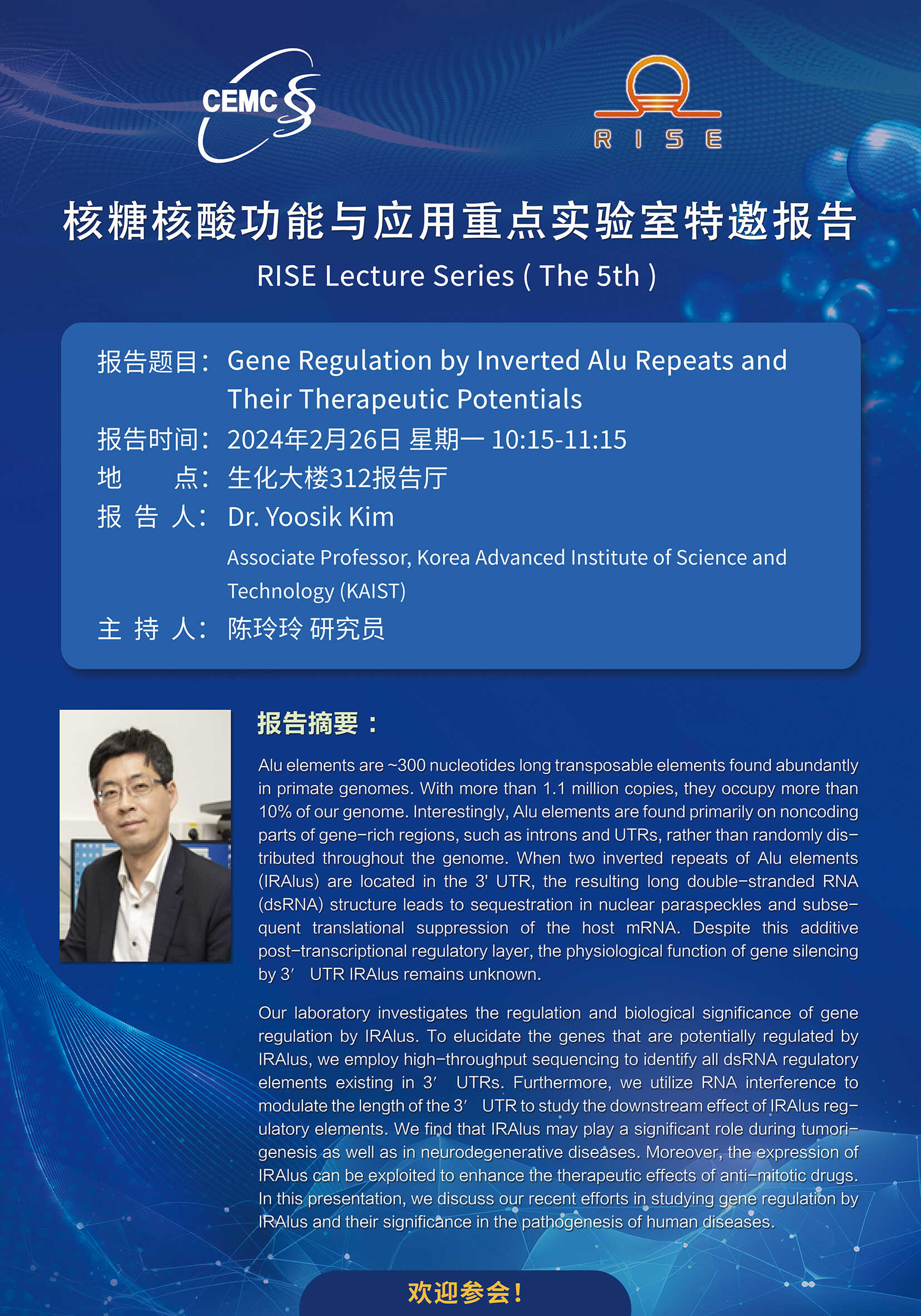 Prof. Yoosik Kim, Korea Advanced Institute of Science and Technology:??Gene Regulation by Inverted Alu Repeats and Their Therapeutic Potentials