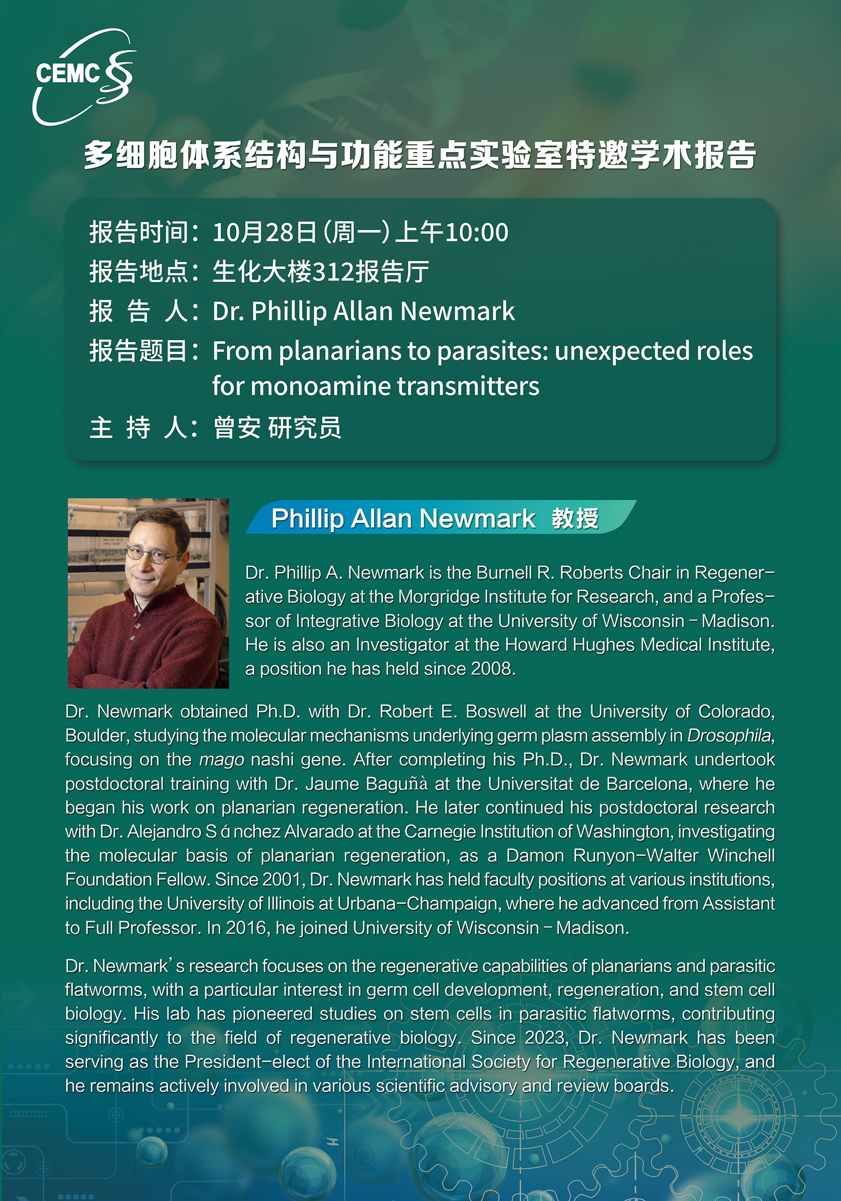 Prof. Phillip Allan Newmark,?Howard Hughes Medical Institute:?From planarians to parasites: unexpected rolesfor monoamine transmitters