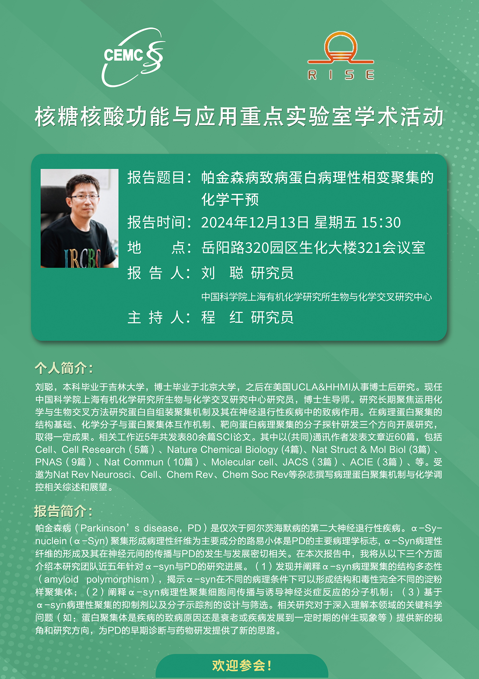 中國科學(xué)院上海有機(jī)化學(xué)研究所?劉聰 研究員:?帕金森病致病蛋白病理性相變聚集的化學(xué)干預(yù)