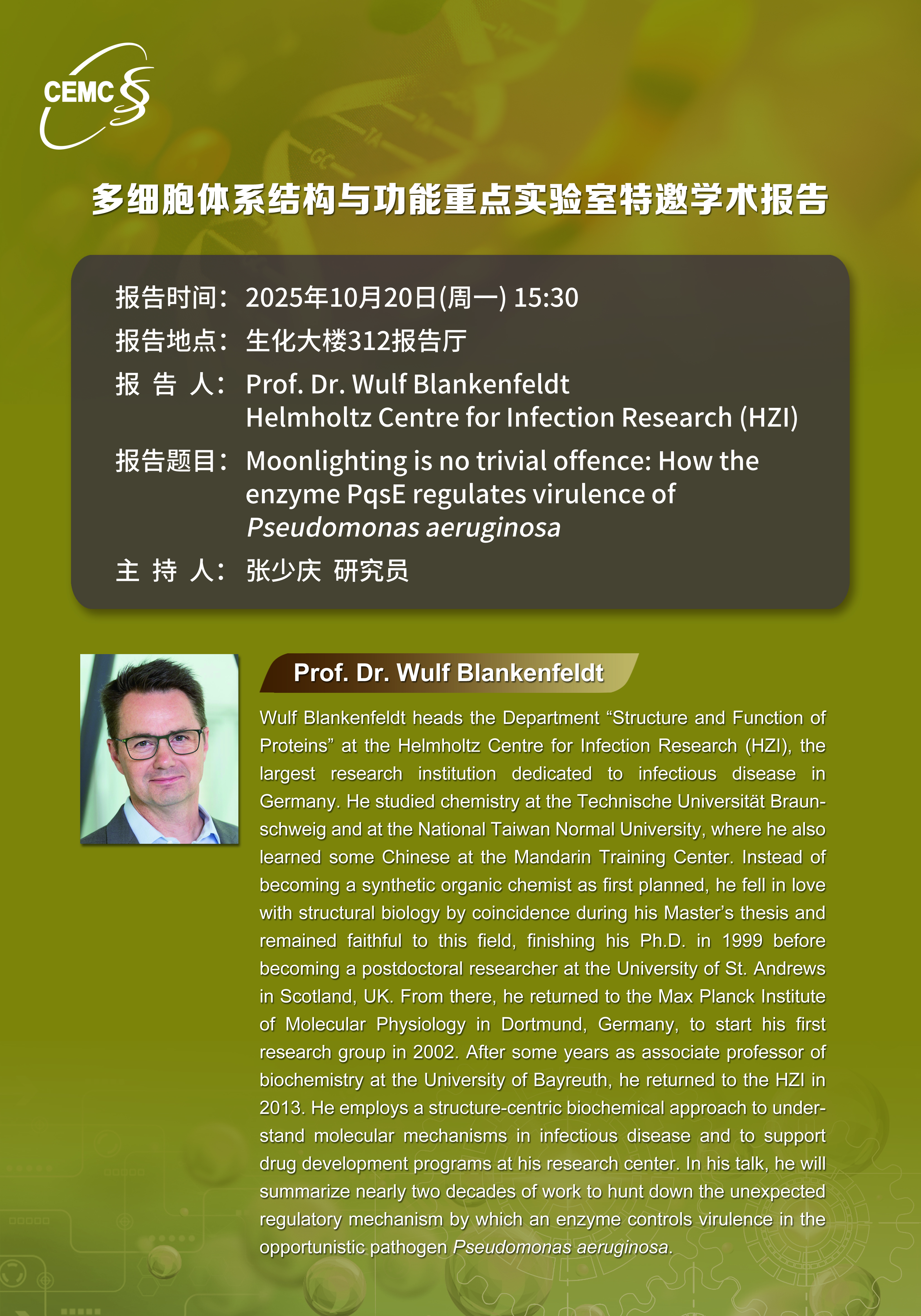 Prof. Dr.Wulf Blankenfeldt,?Helmholtz Centre forInfection Research:?Moonlighting is no trivial offence: How the?enzyme PqsE regulates virulence of?Pseudomonas aeruginosa