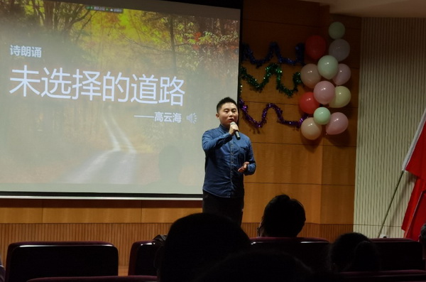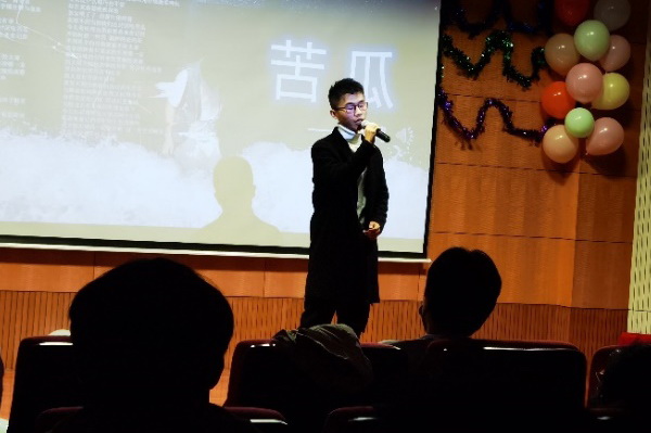 語(yǔ)言類節(jié)目金句頻出,歡聲笑語(yǔ)不斷。高云海同學(xué)朗誦的《未選擇的道路》將大家引入思考人生道路選擇的哲學(xué)深思之中。當(dāng)大家還在糾結(jié)選擇哪條“路”的時(shí)候,霍修楠、鄒龍昊同學(xué)帶來(lái)的《大保鏢》相聲節(jié)目又將晚會(huì)轉(zhuǎn)向輕松愉悅的氛圍,兩人幽默的語(yǔ)言、豐富的肢體動(dòng)作、意料之外的回答引得現(xiàn)場(chǎng)觀眾開(kāi)懷大笑。