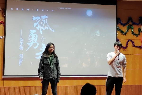 一首首膾炙人口的歌曲,贏得了觀眾一陣陣掌聲?!度缭浮贰犊喙稀泛汀豆掠抡摺返难莩哂糜茡P(yáng)的歌聲表達(dá)著自己面對(duì)困難不屈不撓、敢于做科研“孤勇者”的人生態(tài)度。其中,《孤勇者》的表演者更是與臺(tái)下的觀眾成功對(duì)上了“暗號(hào)”,臺(tái)上臺(tái)下,一齊歌唱,盡顯歡樂(lè)。中心研究生部老師、高年級(jí)同學(xué)通過(guò)演唱《我能給的》《你曾是少年》兩首歌曲表達(dá)了對(duì)中心“新鮮血液”的美好祝愿。