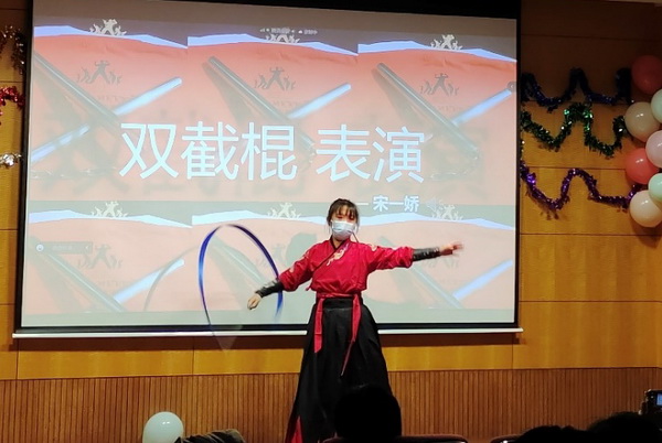 中國(guó)武術(shù)文化博大精深,宋一嬌同學(xué)身著漢服閃亮登場(chǎng),帶來(lái)了柔中帶剛的雙截棍表演,當(dāng)音樂(lè)響起,手中的彩帶隨著雙截棍的揮舞上下翻飛,靈巧、有力;忽然,全場(chǎng)燈光熄滅,熒光雙截棍在黑暗中極速飛舞,瞬間點(diǎn)燃了全場(chǎng)的熱情,贏得掌聲連連。