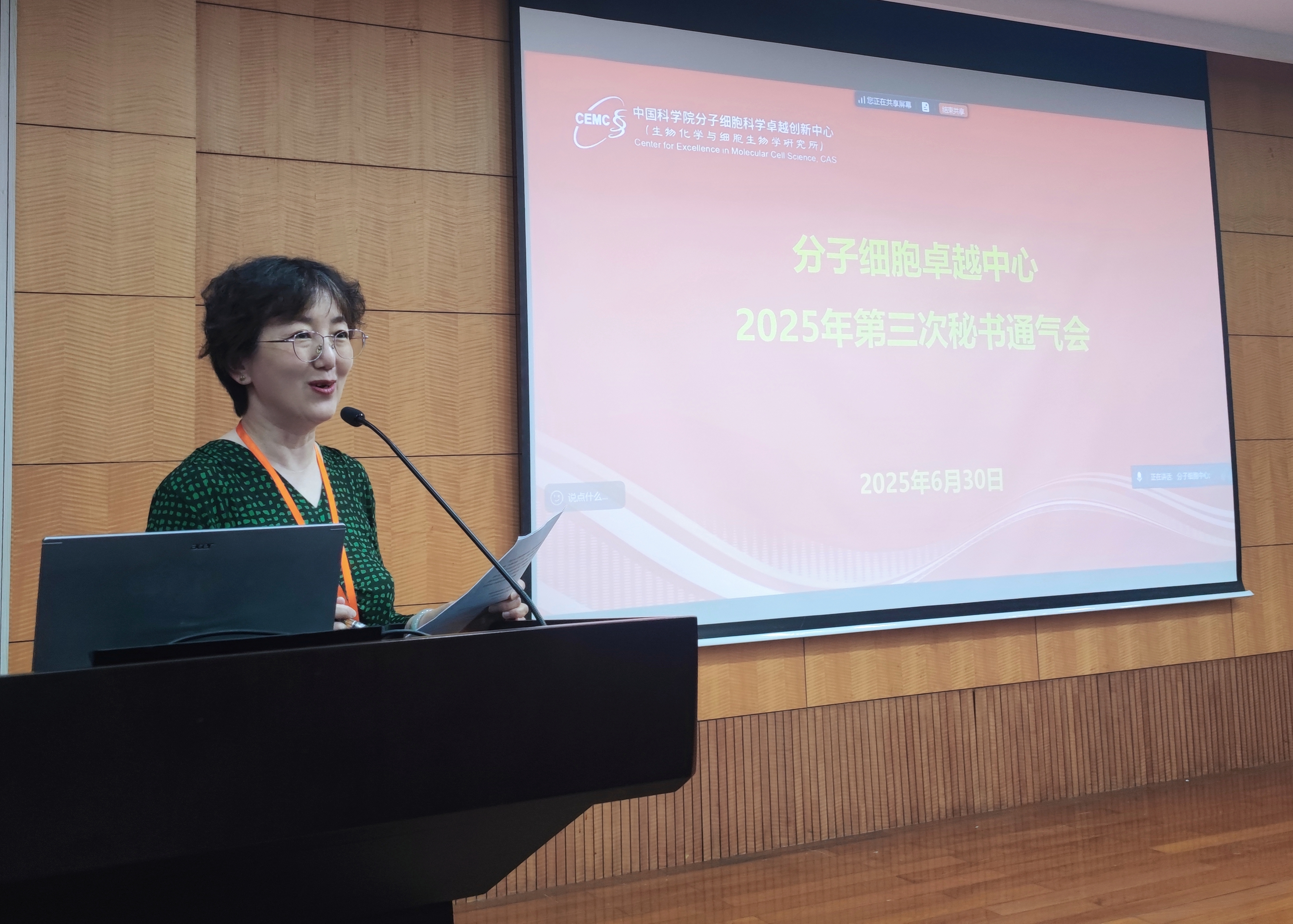 6月30日下午,分子細(xì)胞卓越中心舉行2025年第三次秘書通氣會(huì)暨安全員會(huì)議,60余位研究組、技術(shù)平臺(tái)、編輯部秘書暨兼職安全員,及各職能部門相關(guān)人員參加會(huì)議。