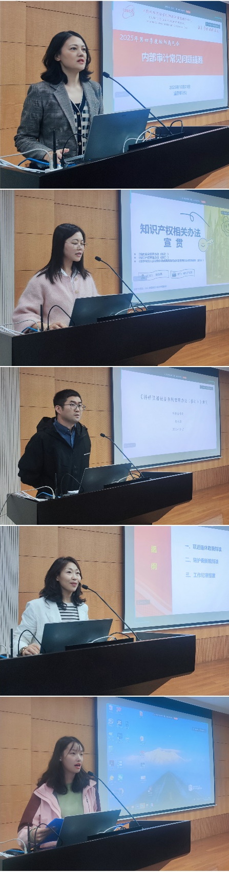會(huì)上,職能部門對(duì)相關(guān)制度和工作要點(diǎn)進(jìn)行宣貫講解。監(jiān)督審計(jì)處傳達(dá)了中國(guó)科學(xué)院警示教育會(huì)精神,結(jié)合中心內(nèi)部審計(jì)工作開展情況,對(duì)常見問題進(jìn)行分析,重點(diǎn)對(duì)采購(gòu)與外協(xié)業(yè)務(wù)潛在風(fēng)險(xiǎn)進(jìn)行提醒;知識(shí)產(chǎn)權(quán)部對(duì)橫向項(xiàng)目管理辦法、知識(shí)產(chǎn)權(quán)管理辦法修訂內(nèi)容進(jìn)行了解讀,并簡(jiǎn)要介紹了中心成果賦權(quán)政策;科技條件處針對(duì)科研儀器設(shè)備采購(gòu)管理辦法的新老條款變化進(jìn)行解讀,并介紹了系統(tǒng)操作流程及注意事項(xiàng);人事管理處圍繞延遲退休政策、陪護(hù)假新規(guī)做細(xì)致講解,結(jié)合院“三項(xiàng)制度”檢查評(píng)估意見,再次強(qiáng)調(diào)了對(duì)嚴(yán)肅崗位工作紀(jì)律的要求;聯(lián)合辦公室作保密警示專題教育。