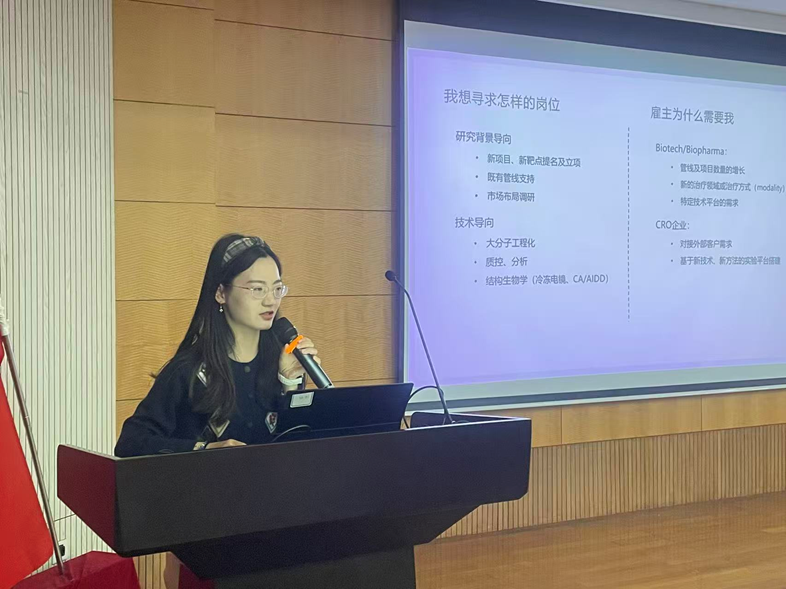 優(yōu)秀畢業(yè)生代表的經(jīng)驗分享環(huán)節(jié),更是干貨滿滿。張顥恩博士結合自身畢業(yè)論文寫作經(jīng)歷,重點分享了論文主體實驗結果部分的寫作思路,詳解討論與展望部分的撰寫方向與技巧,為同學們提供寶貴的實操參考。現(xiàn)就職于百濟神州研究院的徐心怡,以《求職心得——踏出雙向奔赴的第一步》為題,建議畢業(yè)生立足專業(yè)背景,精準匹配企業(yè)崗位需求,從崗位解讀、簡歷打磨到面試準備等方面傾囊相授,助力同學們找準求職方向。上海交通大學附屬胸科醫(yī)院助理研究員武二鵬,則聚焦醫(yī)院科研崗位發(fā)展路徑,深入分析該崗位的優(yōu)勢與挑戰(zhàn)。他指出,醫(yī)院科研崗是一條“接地氣”的學者之路,尤其適合兼具臨床情懷與科研能力的橋梁型人才。