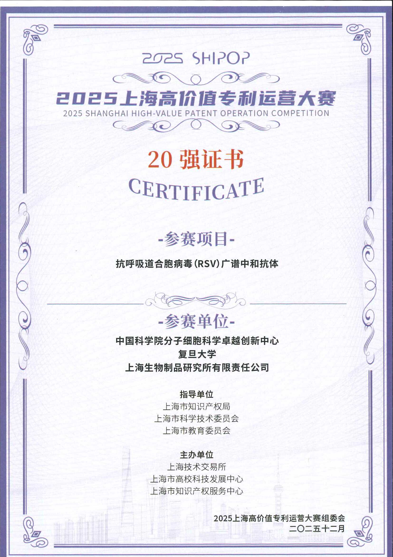 12月25日,上海高價(jià)值專(zhuān)利運(yùn)營(yíng)大賽(以下簡(jiǎn)稱“上高賽”)決賽暨頒獎(jiǎng)典禮隆重舉行。由分子細(xì)胞卓越中心聯(lián)合復(fù)旦大學(xué)合作開(kāi)發(fā)的“抗呼吸道合胞病毒(RSV)廣譜中和抗體”項(xiàng)目,憑借技術(shù)突破與轉(zhuǎn)化成效,從眾多參賽項(xiàng)目中脫穎而出入圍二十強(qiáng),并斬獲“專(zhuān)利許可轉(zhuǎn)讓獎(jiǎng)”。