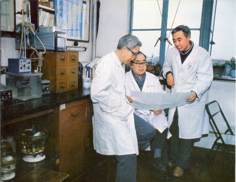 中國(guó)科學(xué)院生物化學(xué)研究所龔岳亭(左)、鈕經(jīng)義(中)、杜雨蒼(右)討論多肽合成新方案
