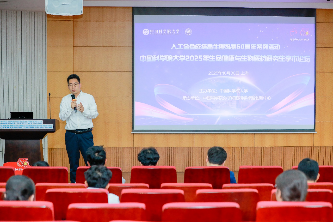 為進一步弘揚科學精神,強化研究生學風建設(shè),營造濃厚的學術(shù)研究氛圍,為學生搭建跨地域、跨單位、跨學科的學術(shù)交流平臺,10月30日,值此人工全合成結(jié)晶牛胰島素成果完成60周年之際,由中國科學院大學主辦,分子細胞卓越中心承辦的“人工全合成結(jié)晶牛胰島素60周年系列活動——中國科學院大學2025年生命健康與生物醫(yī)藥研究生學術(shù)論壇”順利舉辦。中心學位委員會副主席陳勇研究員、相關(guān)領(lǐng)域?qū)<覍W者、導(dǎo)師代表及來自國科大相關(guān)培養(yǎng)單位的200余名研究生參加論壇。論壇特邀復(fù)旦大學生物醫(yī)學研究院陳飛研究員、中國科學院上海營養(yǎng)與健康研究所陳大明研究館員作專題報告,中心博士研究生楊佳穎和張宇航共同主持本次活動。