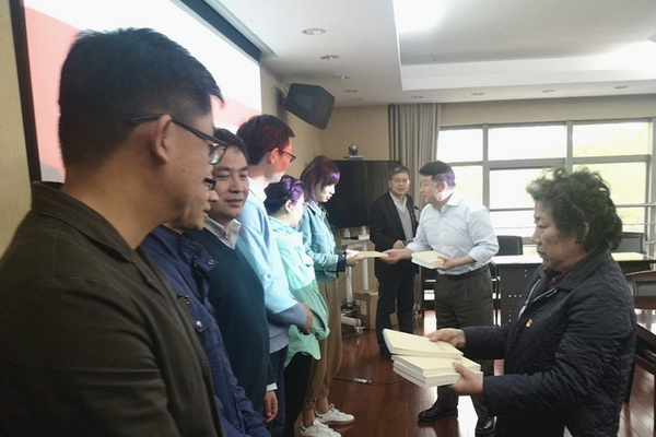 上海分院第二指導組組長郟靜芳和中心主任劉小龍為各黨支部代表授黨史學習教育指定書籍
