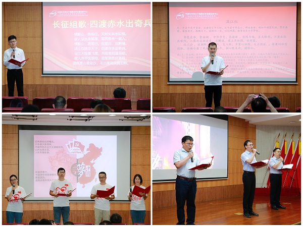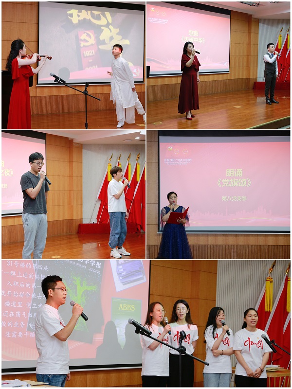 《一生一個(gè)中國,我愛我的祖國》拉開了文藝匯演的序幕,第十黨支部的全體黨員用朗誦帶大家重溫了建黨百年的篳路藍(lán)縷,飽覽了中華大地的壯美山川。行政黨支部用小提琴悠揚(yáng)的旋律,輕盈的舞姿表達(dá)了每一個(gè)中華兒女心底蘊(yùn)藏著的最熾熱的情感。第十一黨支部的朗誦《覺醒》鏗鏘有力地喊出了吾輩當(dāng)代為實(shí)現(xiàn)中華民族偉大復(fù)興的堅(jiān)韌決心。第四支部選送的歌曲《軍港之夜》展現(xiàn)陽剛背后的溫情,愛國擁軍之情油然而生。第五黨支部以朗誦《長征組歌 四渡赤水出奇兵》為大家演繹了不屈不撓、英勇頑強(qiáng)的長征精神,以一曲《天耀中華》道出了中華民族歷經(jīng)無數(shù)風(fēng)雨苦難卻生生不息的堅(jiān)強(qiáng)和理由,祝愿祖國母親能夠國富民強(qiáng),和昌順?biāo)?。第六黨支部創(chuàng)作填詞的《滿江紅 賀建黨百年華誕》情感豐富細(xì)膩,意境深遠(yuǎn)讓人回味,強(qiáng)烈的愛國情懷躍然于舞臺(tái)?!磅r紅的黨旗,經(jīng)歷了100年的洗禮,在祖國山河自豪飄揚(yáng);莊嚴(yán)的黨徽,經(jīng)歷了100載的錘煉,在歷史畫卷中熠熠生輝!”第八支部的詩朗誦《黨旗頌》熱情奔放,氣勢磅礴。退休黨支部帶來的合唱《復(fù)興的力量》將大家?guī)蛄藚R演活動(dòng)的高潮,老同志們飽滿的熱情、真摯的感情和精湛的唱功博得觀眾陣陣喝彩。期刊學(xué)會(huì)黨支部五位同志用情景劇《我們是出版人》詮釋了編輯的奉獻(xiàn)精神,他們不忘“出版人”的初心,默默地服務(wù)于知識(shí)傳播背后。第七黨支部原創(chuàng)詩朗誦《清澈的愛》和第三黨支部原創(chuàng)詩朗誦《百年輝煌從頭憶》,伴我們一起踏上了中國共產(chǎn)黨奠基立業(yè)創(chuàng)造輝煌開辟未來的百年之旅,黨帶領(lǐng)人民建設(shè)新中國的百年奮斗史歷歷在目?!笆菬o數(shù)個(gè)你們站出來,才有無數(shù)個(gè)我們站起來!”活動(dòng)在第三支部的大合唱《沒有共產(chǎn)黨就沒有新中國》中結(jié)束。