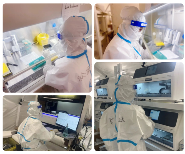 仔細(xì)、嚴(yán)謹(jǐn)、專業(yè)、高效是分子細(xì)胞卓越中心守“滬”PCR行動突擊隊的行為標(biāo)簽。他們在實踐中不斷優(yōu)化實驗操作規(guī)程SOP,完善實驗室布局,根據(jù)不同的采樣管調(diào)整檢測儀器的各項參數(shù),修復(fù)BUG,保證樣品在檢測過程中不受到污染,檢測數(shù)據(jù)準(zhǔn)確無誤、及時上報。每一天都與病毒“親密接觸”,隊員們需要穿著密不透風(fēng)的防護(hù)服承擔(dān)繁重的檢測工作,對于體力和毅力都是極大的考驗。結(jié)束一天工作后的他們,往往眼前早已被水汽打濕,指甲也被汗水泡爛,但他們從不叫苦叫累。對每一份樣本負(fù)責(zé),確保萬無一失,這是隊員們給自己定下的必須嚴(yán)守的工作準(zhǔn)則。