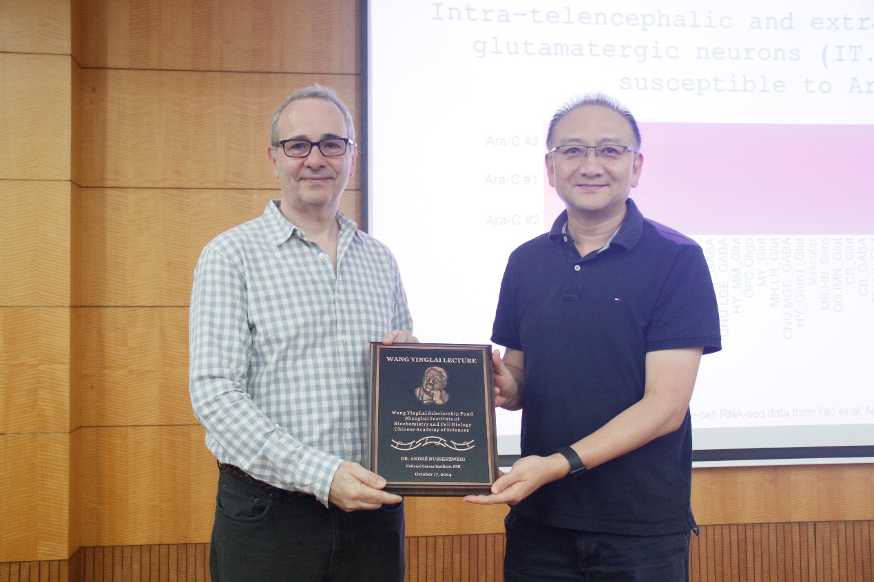 所務(wù)委員陳劍峰研究員為André Nussenzweig研究員頒發(fā)王應(yīng)睞講座榮譽(yù)證書(shū)