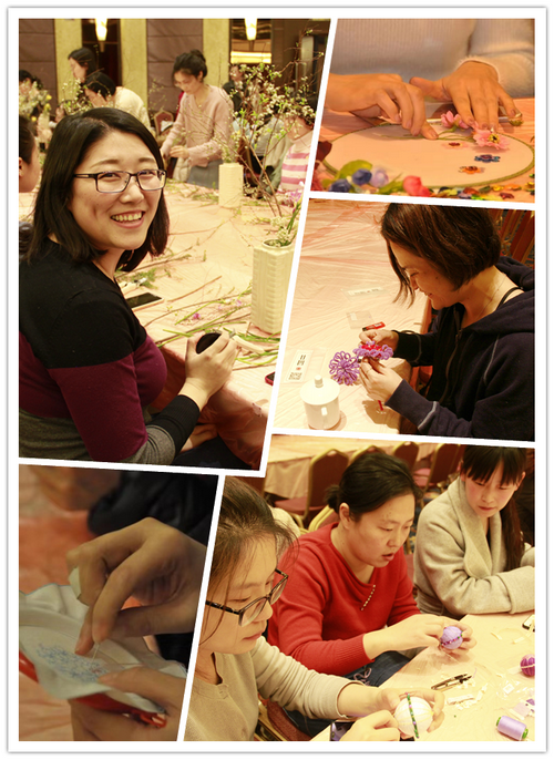 活動現(xiàn)場大家在老師的指導下,有的按植物成長的高低錯落自然形態(tài)設計清雅流暢的插花款式,有的用華麗的珠花和金色閃片點綴喻意美滿團圓的團扇,有的忙著勾織美麗動人的海派絨花,有的在手鏡背面刺繡出心儀的圖案,有的則將染好顏色的彩色經(jīng)緯線編織成五色燦爛的錦繡花團……生化與細胞所的女同胞們個個都善于發(fā)現(xiàn)“美”,創(chuàng)造“美”,緊張的工作之余科研、支撐與行政團隊難得聚在一起愉快交流,放松心情創(chuàng)作自己的作品,用心描繪中國傳統(tǒng)“美”。