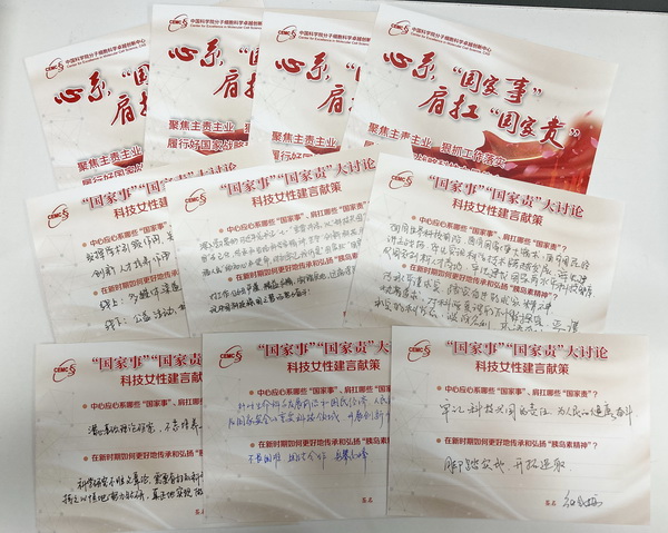 為進(jìn)一步凝聚智慧力量、彰顯擔(dān)當(dāng)作為,中心婦委自3月起還同步舉辦“國(guó)家事”“國(guó)家責(zé)”大討論,組織中心廣大科技女性學(xué)習(xí)上級(jí)精神,積極參與討論。大家以手寫卡片的形式為中心高質(zhì)量發(fā)展建言獻(xiàn)策,思考新時(shí)代女性科技工作者的使命與職責(zé),探討在新時(shí)期更好地傳承與弘揚(yáng)“胰島素”精神,在自己的崗位上為“十四五”新征程開啟,上海加快建設(shè)具有全球影響力的科創(chuàng)中心建功立業(yè)。