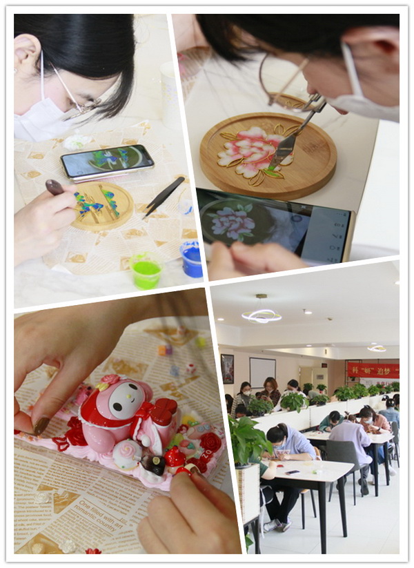 “奶油膠DIY”組的“能工巧匠”們迅速進(jìn)入狀態(tài),在老師的指導(dǎo)下學(xué)習(xí)完擠膠后就開始按照自己的設(shè)計(jì)圖紙裝點(diǎn)手機(jī)殼和筆筒,短短一個(gè)小時(shí)大家就陸續(xù)曬出了制作完成的作品。另一邊的“掐絲琺瑯”組則陷入“苦戰(zhàn)”,看似簡(jiǎn)單的描圖掐銅絲,實(shí)際上非常考驗(yàn)?zāi)托呐c細(xì)心,最后的暈染上色更是需要精益求精,讓每一幅“千里江山圖”與“出水芙蓉照”都逼真再現(xiàn)、栩栩如生?;顒?dòng)中大家將科研創(chuàng)新中最擅長(zhǎng)的奇思妙想與“傳統(tǒng)+新潮”兩種手工藝相融合,以對(duì)待實(shí)驗(yàn)數(shù)據(jù)同樣的“精工細(xì)作”制作手工藝品,感受與科研工作不同的指尖上的“美”,用心繪制多彩世界,點(diǎn)燃科研熱情。