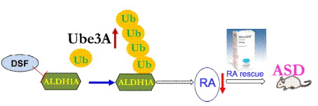 工作模型:泛素連接酶UBE3A的過度激活引發(fā)底物ALDH1A家族蛋白的過量泛素化,抑制視黃酸(RA)合成、破壞神經(jīng)突觸可塑性而導(dǎo)致自閉癥(ASD)。
