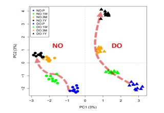 胃旁路手術(shù);然后分別在手術(shù)前和手術(shù)后(1周、3個月和1年),提取每個患者餐前餐后共12個時間點的血漿及詳盡的臨床數(shù)據(jù)。隨后,基于時間序列的連續(xù)樣本,研究人員同時采集了血漿蛋白質(zhì)組和代謝物組數(shù)據(jù)。進一步,研究人員發(fā)展了基于“邊”的網(wǎng)絡(luò)計算理論和方法。由此發(fā)現(xiàn):肥胖糖尿病患者(DO)和非糖尿病肥胖個體(NO)的治愈路徑有明顯的區(qū)別,兩個人群在康復(fù)后的分子網(wǎng)絡(luò)狀態(tài)是更加遠(yuǎn)離,而不是接近。也就是說,代謝性手術(shù)治療糖尿病有著獨立于減重的分子途徑,這對于糖尿病的治療無疑是一個好消息。