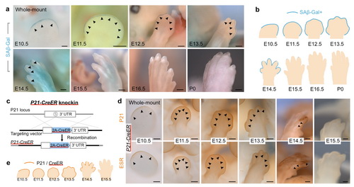 本研究中,研究人員首先通過P21和SAβ-Gal的染色確認(rèn)它們在四肢頂外胚層嵴處從E15.5天開始消失。為了揭示胚胎期衰老細(xì)胞的命運(yùn),研究人員在周斌研究員的指導(dǎo)下,利用胚胎時期細(xì)胞衰老的分子標(biāo)志P21,構(gòu)建了