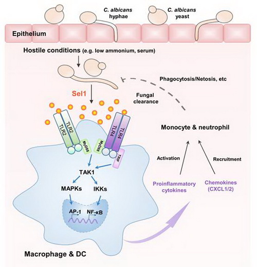 白念珠菌通過侵襲性感染,突破表皮屏障侵入機(jī)體組織,在血液等宿主環(huán)境中大量誘導(dǎo)表達(dá)和分泌Sel1,白念珠菌分泌的Sel1能被巨噬細(xì)胞和樹突狀細(xì)胞的TLR2和TLR4所識(shí)別,激活細(xì)胞內(nèi)IKK/NF-κB和MAPK/AP-1等信號(hào)通路,產(chǎn)生大量的細(xì)胞因子與趨化因子,進(jìn)而通過招募和活化中性粒細(xì)胞和單核細(xì)胞,激活宿主天然免疫應(yīng)答以清除入侵真菌,從而保護(hù)宿主。