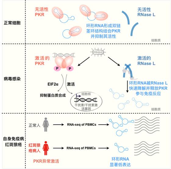 在這項最新的研究中,科研人員首次發(fā)現(xiàn)環(huán)形RNA在細(xì)胞受病毒感染時被核糖核酸酶RNase L降解的過程,并解析了環(huán)形RNA形成16-26 bp的雙鏈RNA莖環(huán)結(jié)構(gòu),并以此為基礎(chǔ)結(jié)合天然免疫因子PKR的特性。深入研究發(fā)現(xiàn),在正常細(xì)胞狀態(tài)下,環(huán)形RNA通過結(jié)合PKR并抑制其活性,避免了PKR過度激活引起免疫反應(yīng);而當(dāng)細(xì)胞被病毒感染時,環(huán)形RNA被RNase L快速降解進(jìn)而釋放PKR參與細(xì)胞的天然免疫炎癥反應(yīng)。進(jìn)一步通過對系統(tǒng)性紅斑狼瘡病人來源的外周血單核細(xì)胞分析表明,在病人體內(nèi)環(huán)形RNA普遍低表達(dá)且PKR異常激活;而增加環(huán)形RNA則可以顯著抑制病人來源外周血單核細(xì)胞和T細(xì)胞中的PKR及其下游免疫信號通路的過度激活。這些發(fā)現(xiàn)不僅首次揭示了環(huán)形RNA的降解途徑及其特殊二級結(jié)構(gòu)特征,并發(fā)現(xiàn)環(huán)形RNA發(fā)揮天然免疫炎癥反應(yīng)調(diào)控的全新功能。相關(guān)研究進(jìn)展為環(huán)形RNA代謝和功能研究奠定了重要基礎(chǔ),也為炎癥性自身免疫病系統(tǒng)性紅斑狼瘡的發(fā)病機(jī)制提出了環(huán)形RNA參與的新型機(jī)制。
