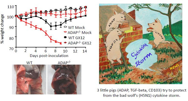 在王紅艷研究員的指導下,博士研究生李春陽、研究人員焦少灼和王國俊博士等人發(fā)現(xiàn):(1)ADAP與TRAF6、TAK1形成復合物,活化SMAD3,促進CD8+ T細胞以自分泌方式產(chǎn)生TGFβ1;(2)在外源性TGFβ1刺激后,CD8+ T細胞同樣依賴ADAP、TRAF6、 TAK1和SMAD3,誘導整合素CD103的表達;(3)與H5N1禽流感病毒感染的野生型小鼠相比,ADAP基因缺失小鼠顯著增加了死亡率。相比肺內(nèi)浸潤的野生型CD8+ T細胞,ADAP缺失的CD8+ T細胞顯著降低TGFβ1、CD103的表達水平;(4)更重要的是,過繼轉(zhuǎn)移野生型T細胞或ADAP KO T細胞到Rag1敲除的受體小鼠后,ADAP KO T細胞不能有效保護宿主抵御H5N1病毒感染。綜上所述,本研究提出CD8+ T細胞利用ADAP-TRAF6-TAK1-SMAD3信號通路,正反饋促進TGFβ1的產(chǎn)生及誘導CD103的表達,在阻斷細胞因子風暴和保護宿主抵御禽流感病毒感染中發(fā)揮免疫保護功能。