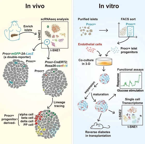 第一部分的工作發(fā)現(xiàn)并鑒定了小鼠胰島的Procr+成體干細(xì)胞(左);第二部分工作建立胰島類器官培養(yǎng)和長(zhǎng)期擴(kuò)增的體系 (右)。第一部分的發(fā)現(xiàn)是第二部分的基礎(chǔ),第二部分在體外展示了Procr+細(xì)胞的應(yīng)用潛力,也進(jìn)一步印證了Procr+細(xì)胞的干細(xì)胞性質(zhì)。