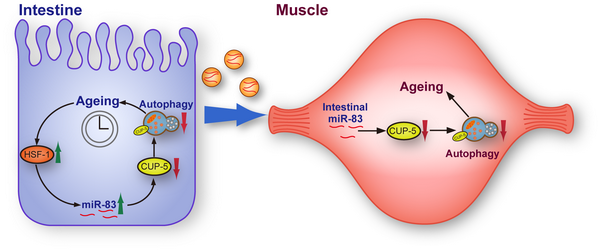 沈義棟組的最新研究發(fā)現(xiàn)隨著衰老hsf-1/HSF1在線蟲腸道中激活了mir-83/miR-29的表達,這導致了mir-83的下游靶基因cup-5/MCOLN的表達被抑制。cup-5作為一個溶酶體蛋白,其表達量的降低會影響溶酶體的數(shù)量及功能,進而抑制了腸道中的自噬。盡管mir-83不在肌肉組織中被轉(zhuǎn)錄,但是研究人員發(fā)現(xiàn)腸道中成熟的mir-83序列(mature miR-83)可以被運輸?shù)襟w腔和肌肉細胞中,然后通過同樣的分子機制抑制肌肉中的自噬,最終導致了線蟲整體性的衰老。研究人員還發(fā)現(xiàn)miR-83的跨組織運輸很有可能是通過胞外囊泡實現(xiàn)的。