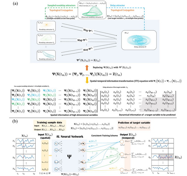 Figure 1 (圖1): Anticipated Learning Machine (ALM:預見性學習機器-神經(jīng)網(wǎng)絡). (a) The general principle of Anticipated Learning Machine. The observed attractor, a delay attractor and sampled nondelay attractors are all topologically conjugate with each other. Each sampled nondelay attractor preserves the dynamical information of the system in different ways. By integrating the information contained in these sampled nondelay attractors, we could find an accurate one-to-one map even under noise deterioration. (b) Anticipated Learning Machine. For each future value, those maps are co-trained into a unified map